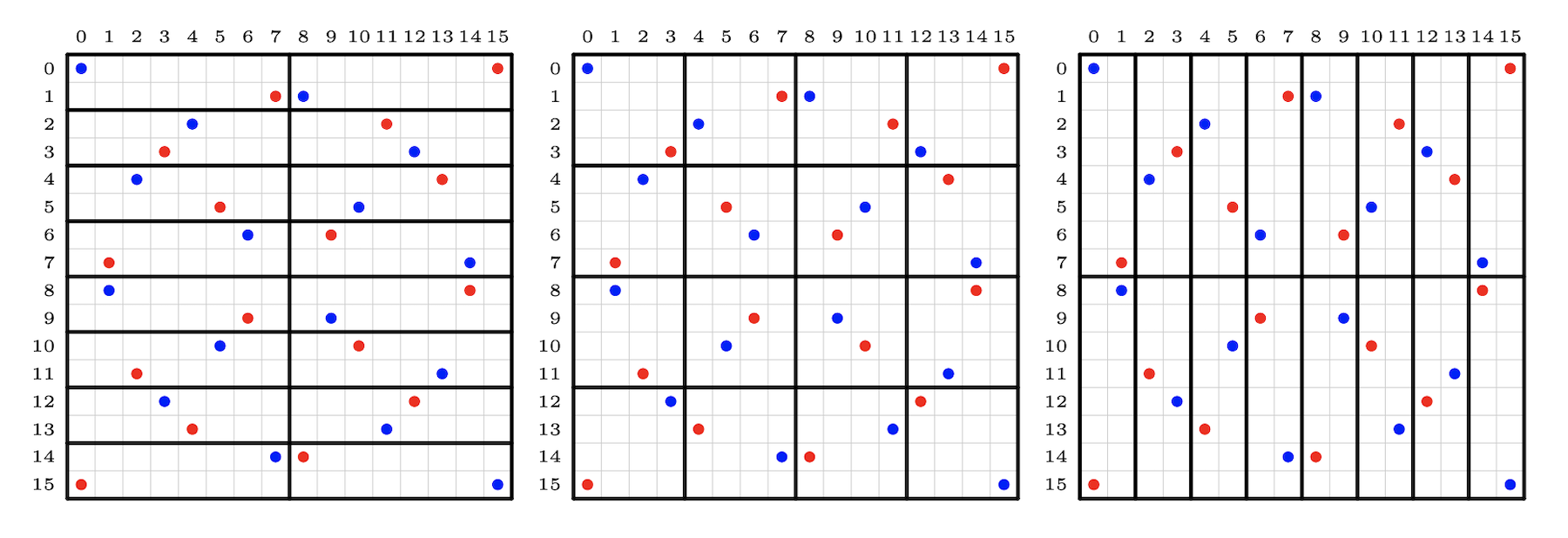 Even more striking is which permutations appear as the vertices of this hypercube. They are precisely those whose binary digits are “perfectly distributed at every binary scale.” To explain what this means, recall that a permutation (or shuffling of cards) can be visualized as a matrix indicating where each card ends up after shuffling. For instance, in the example below, the blue shuffle sends card 0 to 0, card 1 to 8, card 2 to 4, and so on. The picture below shows two such permutations: the red one and the blue one. In this example one can see that “perfectly distributed at every binary scale” means that each of the rectangles drawn there contains exactly one entry of the permutation.
