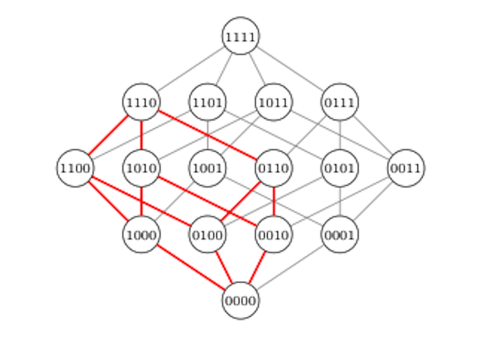 A hypercube of dimension n is the shape whose vertices correspond to all possible choices of n bits, each either 0 or 1. Two vertices are connected when they differ in exactly one of these choices. It is the natural n-dimensional generalization of an ordinary cube. For example, when n = 2, the hypercube is just a square. In the 4-dimensional hypercube shown below, pick any two vertices that are “distance 3” apart, for instance, 0000 and 1110. If you highlight all the shortest paths between them, you will see that they fit together to form an ordinary (3-dimensional) cube.