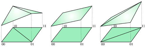 Figure 2. Fitness landscapes in the simple situation of two biallelic loci (negative, zero, and positive epistasis).