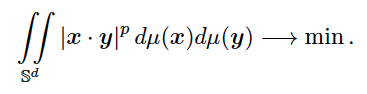 A variant of this problem arises naturally in signal processing: when [math]$p=2$[/math] the minimizers of this energy are precisely isotropic measures, and in the discrete case these are unit norm tight frames (generalizations of the notion of orthonormal basis). Intuitively, the energy in the above expression is minimized by measures [math]$ \mu $[/math] supported on vectors which are “most orthogonal” on the average, however, the realization of this heuristic principle seems to be very different depending on the value of [math]$p$[/math]. For even values of [math]$ p $[/math], the uniform surface measure on [math]$ \mathbb{S}^d $[/math] is a minimizer, and spherical designs (polynomial quadrature rules on the sphere) of order [math]$p$[/math] are discrete minimizers. But for other values of [math]$p$[/math] the situation is much more complicated.
