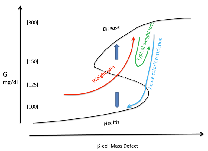Recent data from Yuval Dor and colleagues suggest, however, that G per se is not the signal for proliferation, but rather beta-cell workload (secretion per cell). Sherman and Ha incorporated this into an extended model and showed that control of workload naturally leads to control of G by increase of beta-cell mass. Indeed, workload is an order of magnitude more sensitive as an indicator of insulin resistance than G because secretion rises much more after meals. The bifurcation diagram of the system (shown schematically in the figure) also clarifies the disease process. If people gain weight over time, they become insulin resistant, which not only increases the demand for insulin but hinders beta-cell proliferation. The metabolic state follows the red arrow up and to the right. Until the threshold (dotted line) is crossed, beta cell proliferation is adequate to combat high glucose (downward blue arrow). In this pre-diabetic phase, it is sufficient to stop getting worse by improving diet and exercise. Once the threshold is crossed, however, there is a net loss of beta cells and diabetes ensues. Reversal of the disease now requires a strong and rapid decline in G or improvement of insulin resistance to overcome the tendency for G to keep increasing (upward blue arrow). Typically achievable weight loss by diet and exercise is too slow and almost always fails (green arrow). Only acute caloric restriction by, for example, invasive bariatric surgery can bring the patient back below threshold to the healthy range (cyan arrow). The model informs the search for non-invasive cures by showing that, whatever the molecular mechanism, successful therapy requires a sharp reset of the system. The model also accounts for why prevention of T2D is much easier than cure and may be useful for reinforcing public service messaging to promote prevention.