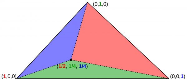 The barycentric coordinates of a triangle were introduced by August F. Möbius in 1827. They describe a point in a triangle relative to the three vertices of the triangle. A point in the interior of a triangle splits the triangle into three smaller triangles, as seen in the first figure. The ratios of the three areas of the smaller triangles by the area of the big triangle are the barycentric coordinates of that point. For instance, in the first figure, the area of the red triangle is ½ of the area of the big triangle. The areas of the blue and the green triangle are each ¼ of the area of the big triangle.