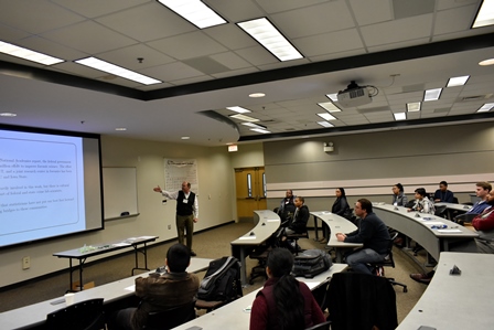 Lum was followed by David Banks , SAMSI Director, who spoke about his experience as an expert witness in a case involving potential ethnic bias and a local sheriff. Banks explained how research professionals are chosen and deposed by the legal system and what criteria were used in his case to determine guilt or innocence.