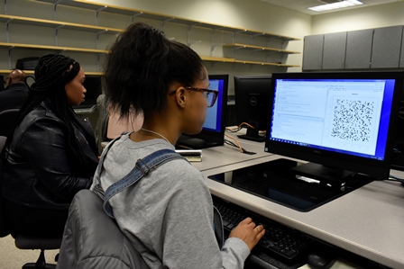 Ciara Allen, an undergraduate mathematics major at NCCU, works with R Software during a practical exercise at the Statistics in the Criminal Justice System Workshop on the NCCU campus, Mar. 24. Allen and several other students attended the one day workshop to learn about this software, used in statistical analysis, and how to prepare for a future career in math and/or science fields of study. The event marked the first time SAMSI has hosted a workshop on the campus of an HBCU.