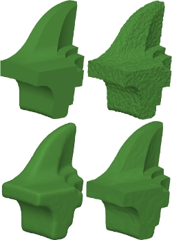 Figure 1. A demonstration of the Elsey-Esedoglu smoothing algorithm. Top left: Original object. Top right: Noise-added version. Bottom left: Smoothed version using a standard method. Bottom right: Smoothed version using the Elsey-Esedoglu algorithm.