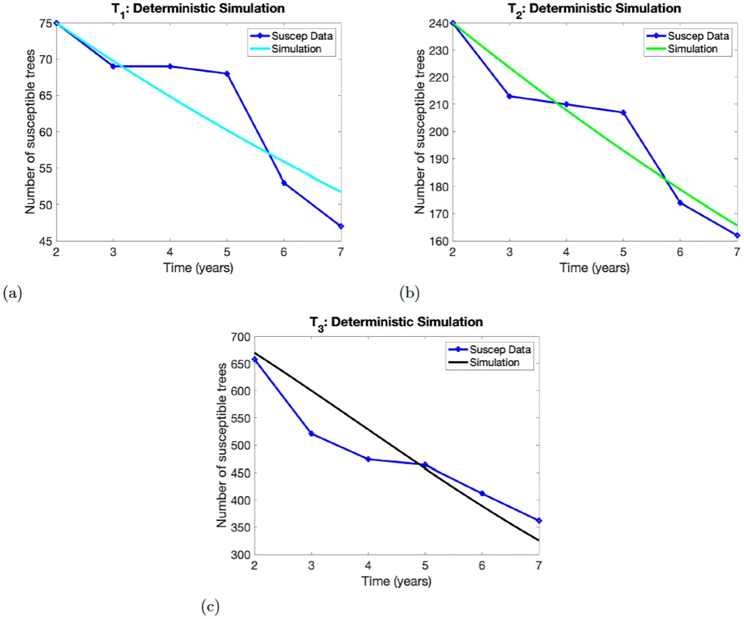 The SQuaRE’s research uses two deterministic models (with and without delay) and two stochastic models to capture the infection transmission dynamics of the virus in cacao trees using data from three types of treatment over a period of seven years. The differences between the treatment types ( \( T_1\), \( T_2\), and \( T_3\)) lie in the number and placement of inoculated trees. For example, their deterministic model is given by an ODE relating susceptible trees \( X \), the average number of mealybugs per severely infected tree \( J \), a parameter \( p \) representing the transmission probability, and the number of severely infected trees in a given plot \( Z \):